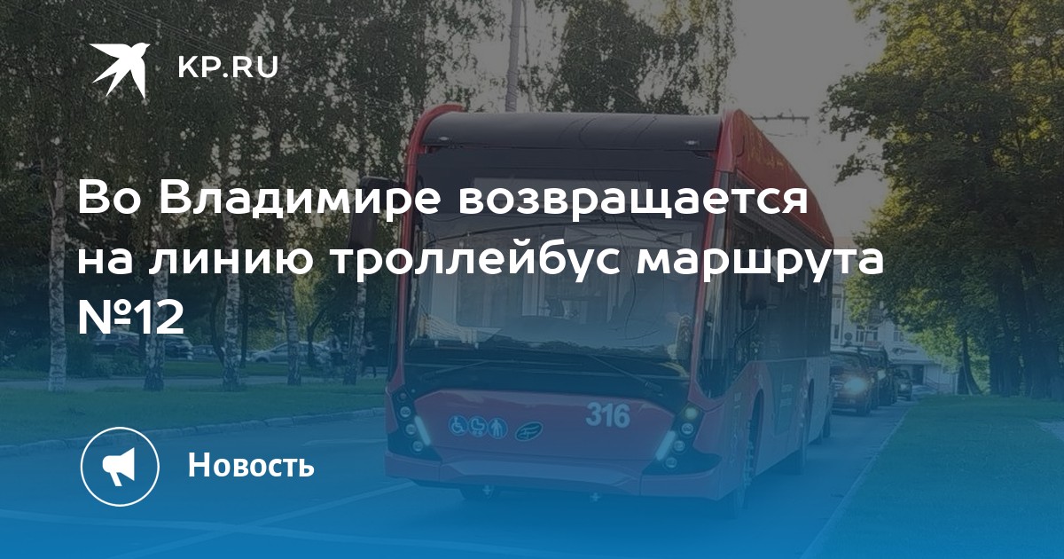 Как сообщает администрация города Владимира, с 11 апреля в областном центре возвращается на линию упраздненный несколько лет назад троллейбус №12. Данный троллейбус будет ездить от Вокзальной площади через остановки «Площадь Фрунзе», «Детская больница», «ГБ №5», «Сады на Добросельской», «улица Егорова», «улица Комиссарова», универмаг «Восток», парк «Добросельский», «улица Радищева», «улица Безыменского», «Универсам», «Магазин Ополье», «Поворот на улицу Куйбышева», «Улица Куйбышева».